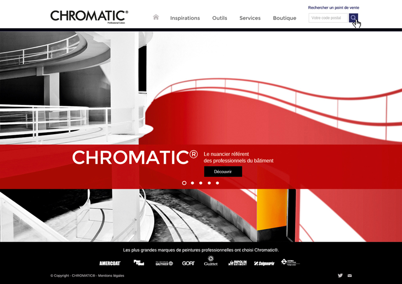 - les applicateurs peintres s’appuient, quant à eux, sur un outil de référence et un langage commun de la couleur à haute performance technique grâce au nuancier professionnel le plus diffusé en France, disponible dans plus de 700 points de vente et sur chromaticstore.com. Ils accèdent également aux outils en ligne pour accompagner leurs clients dans la sélection des couleurs (palette digitale, proposition d’harmonies couleur, simulateur déco...), et bénéficient de conseils et services en ligne (échantillons sur mesure, étude coloristique, twitter) pour se différencier et mieux vendre leurs devis.