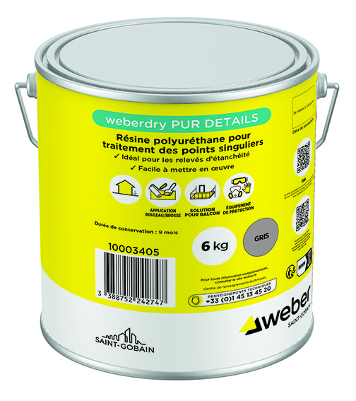La gamme weberdry PUR repose sur l’utilisation coordonnée de l’ensemble de ses composants. La préparation commence avec weberprim PUR 1K, primaire appliqué en une couche de 200 g/m² sur un support sain, propre, plan et sec. Les points singuliers sont ensuite traités avec weberdry PUR détails, utilisé au pinceau, puis renforcés par l’armature weberdry PUR fabric, disponible en rouleaux de 20 cm × 100 m et 1 m × 100 m, destinée au traitement des angles et relevés d’étanchéité. Après un temps de séchage compris entre 12 et 18 heures, l’étanchéité liquide weberdry PUR seal est ensuite appliquée en 2 couches à raison de 1,8 kg/m² au total. Enfin, la résine de finition colorée weberdry PUR coat (disponible en 3 couleurs, blanc, gris clair et gris foncé) vient compléter le système pour protéger et garantir performance et tenue esthétique dans le temps.