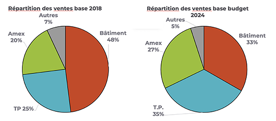 En effet, depuis 2018, Alkern, grâce entre autres aux acquisitions réalisées, possède une En effet, depuis 2018, Alkern, grâce, entre autres, aux acquisitions réalisées, a construit une ventilation bien plus équilibrée de ses activités, positionnant le groupe d’une façon beaucoup moins exposée au marché du bâtiment qu’auparavant. Si l’année 2023 est marquée par la chute des constructions de logements neufs français (cumul des taux élevés, inflation forte et arrêt des aides de l’état), le segment bâtiment de l’activité Alkern ne pèse plus que 33 % (vs 48 % en 2018). A contrario, son activité aménagement extérieur croît de 20 à 27 % et celle des TP passe de 25 à 35 %.