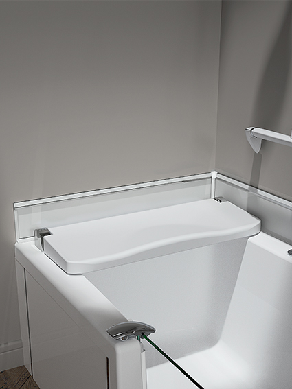 L’équipement de ce pack, orienté senior, se distingue par la présence d’une douchette à main aimantée et la forme en T de la barre de douche qui se transforme ainsi en barre de maintien. Le Pack Sérénité+, convenant parfaitement au remplacement d’une ancienne baignoire, offre également un siège blanc à large assise, rabattable avec frein de chute, qui se déclipse aisément pour faciliter le nettoyage, ainsi qu’un coussin repose-tête ergonomique blanc, côté bain. La finition de ce pack n’oublie pas les tendances déco actuelles : les tabliers, en verre blanc ou noir, dotés de fileurs latéraux découpables se marient parfaitement aux crédences blanches avec liseré en aluminium chromé. Enfin pour compléter l’équipement de Sérénité+, Kinedo propose en options diverses barres de maintien ainsi qu’un revêtement anti-dérapant à appliquer.