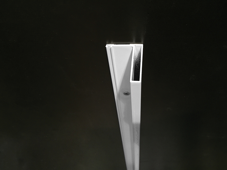 Ainsi, les profilés verticaux destinés à recevoir les parois se présentent avec leurs ailettes tournées vers l’extérieur. Leur fixation aux murs de la salle de bains s’opère donc depuis l’extérieur de la douche, garantissant de facto un receveur protégé qui se double d’un confort de travail accru pour le poseur.