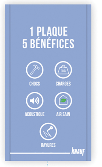 Par exemples chez Knauf, la plaque Diamant est la seule plaque multi-bénéfices du marché à allier la résistance des murs, l’isolation acoustique et la qualité de l’air intérieur ou encore la présence originale dans l’offre Knauf d’une plaque de sol, Knauf Brio, une solution de chape sèche pour des rénovations rapides des sols carrelés des cuisines et salles de bains.