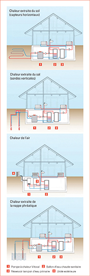 Leur principe de fonctionnement permet d’extraire et de démultiplier les calories de l’air, de l’eau ou de la terre pour les exploiter dans l’habitation via le système de chauffage. Ainsi par exemple, pour 1 kWh consommé, les pompes à chaleur Viessmann produisent et restituent entre 3,5 et 5,5 kWh ! De quoi réaliser de considérables économies d’autant que leur coût de fonctionnement s’avère des plus attractifs : 4,1 cents/kWh, contre 7,4 cents pour le fioul, 5,1 cents pour le gaz naturel.