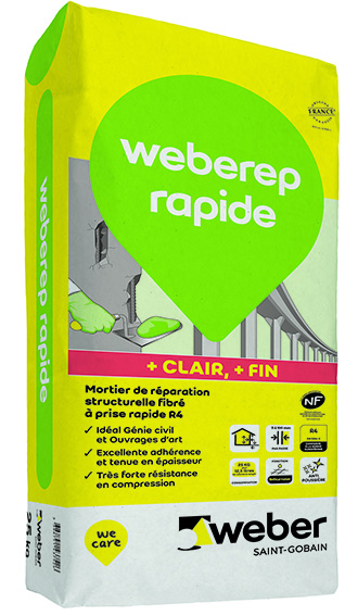 Précisons que weberep rapide, mortier de réparation structurelle classé R4, convient à tous les types de réparation ponctuelle sur support béton, enduit ciment, maçonnerie de blocs béton, briques pleines et pierres dures. Utilisable en horizontal, vertical, sous-face, en intérieur et extérieur, weberep rapide se destine aux ouvrages aériens, souterrains ou encore immergés. Weber préconise notamment weberep rapide pour la réparation d’ouvrages de génie civil et d’ouvrages d’art ainsi que le rebouchage d’épaufrures, nez de marches, trous, saignées, carottages, mais aussi pour le scellement courant (pattes de fixation ou gonds), la réalisation de gorges de cuvelage...